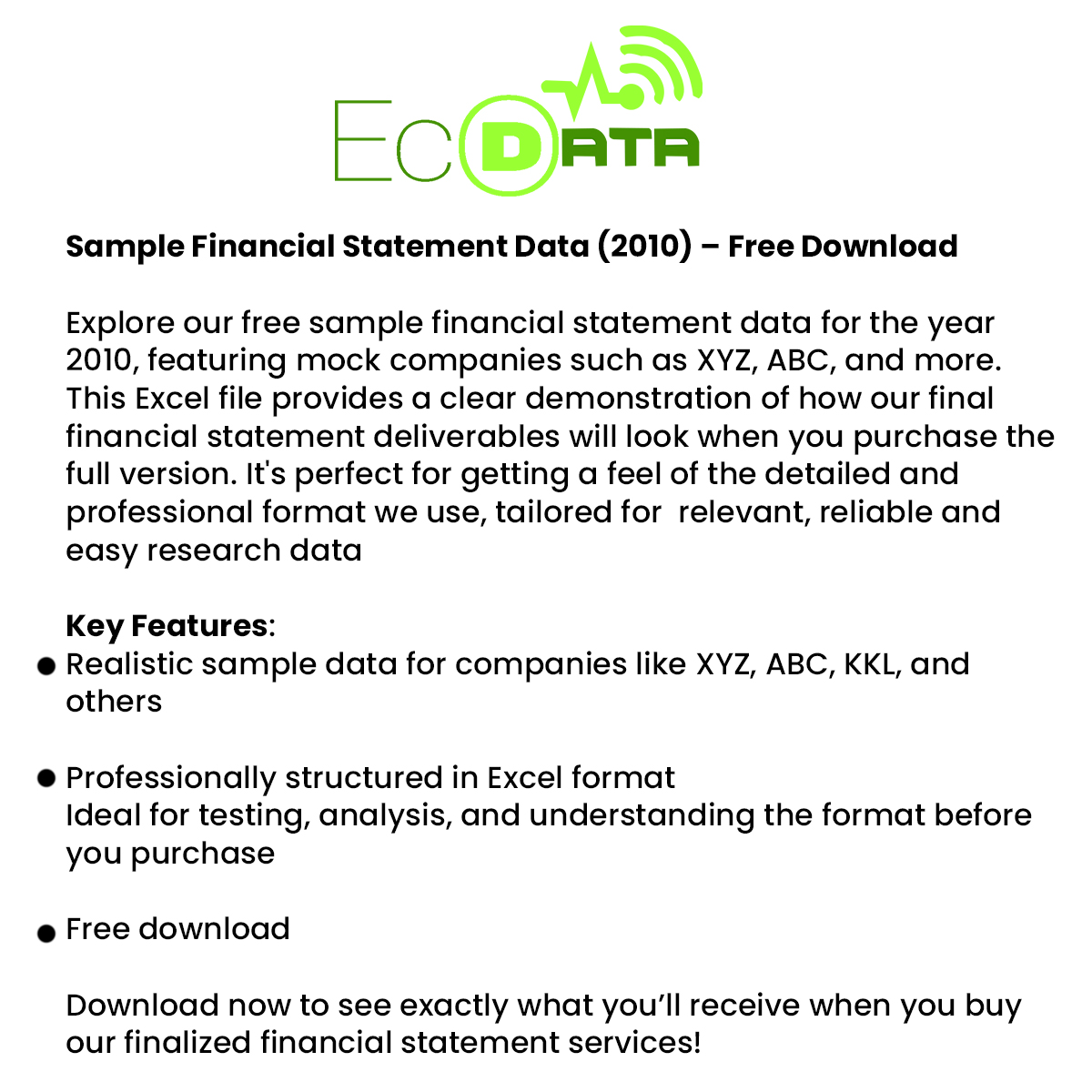 Explore our free sample financial statement data for the year 2010, featuring mock companies such as XYZ, ABC, and more. This Excel file provides a clear demonstration of how our final financial statement deliverables will look when you purchase the full version. It’s perfect for getting a feel of the detailed and professional format we use, tailored for easy research purposes